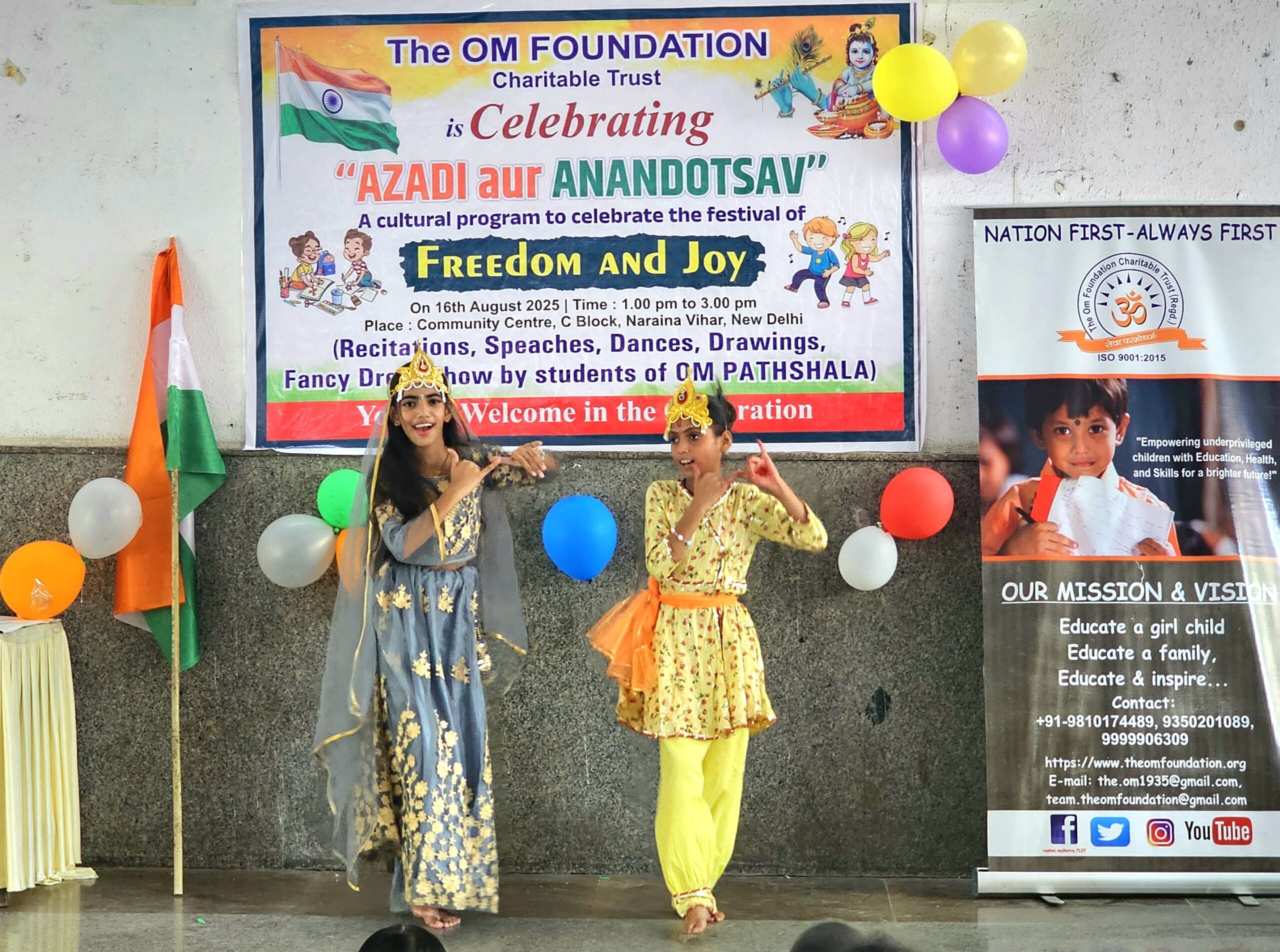 On 16th August 2025, OM Pathshala, an initiative for educating underprivileged children by The OM Foundation Charitable Trust, Naraina Vihar, New Delhi, celebrated a unique blend of Independence Day and Shri Krishna Janmashtami. The children filled the evening with joy and devotion through patriotic speeches, soulful poems, and mesmerizing dances. Dressed as Radha and Krishna, they brought Vrindavanโs divine spirit alive on stage while also saluting our tricolor with pride.
